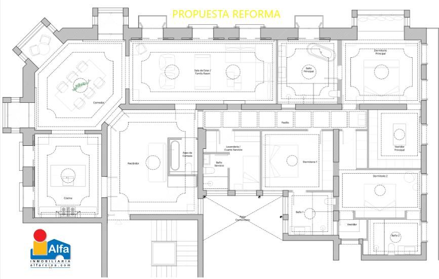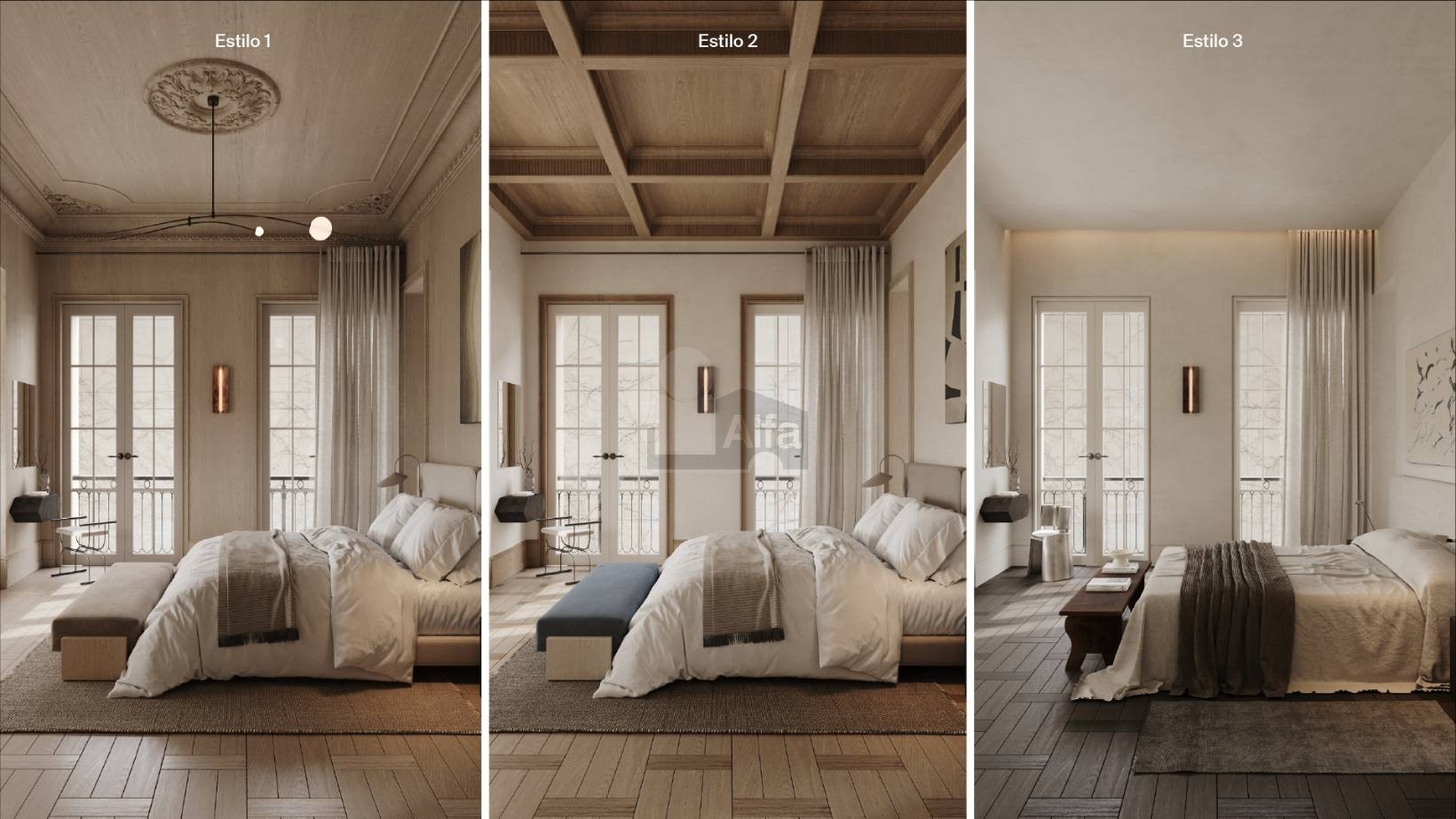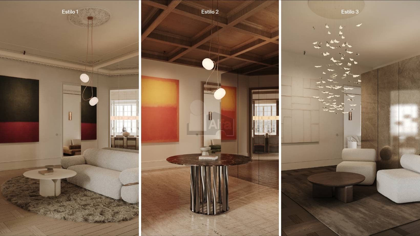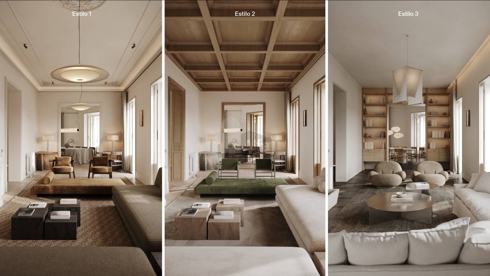 La propuesta de arquitectura e interiorismo para la propiedad se centra en realzar los elementos clásicos existentes, como cornisas y detalles de puertas y ventanas, integrándolos con elementos contemporáneos para crear un ambiente único. Este enfoque busca armonizar lo clásico y lo moderno, destacando el valor de cada elemento y mejorando la calidad del espacio. La distribución prioriza la conexión de los espacios de día, ubicándolos en la fachada principal. La cocina se orienta hacia la calle Goya, mientras que el comedor y zonas íntimas, como una acogedora zona de desayuno, se sitúan en los miradores. Estas áreas se conectan a una amplia zona social y un family room, facilitando la interacción y disfrute de los espacios comunes. El hall de entrada es un espacio funcional y agradable, ideal para conversaciones o disfrutar de una copa con amigos, y se busca minimizar la zona de pasillo para optimizar su función como conexión entre áreas comunes y dormitorios. La distribución de los dormitorios incluye una zona de servicio y un primer dormitorio con baño en suite. El dormitorio principal, con mirador hacia la calle Castelló, dispone de baño y vestidor exteriores. El tercer dormitorio cuenta con acceso a un vestidor, baño en suite exterior y vestidor complementario. El diseño equilibra funcionalidad, estética y comodidad, reforzando la convivencia entre lo clásico y lo contemporáneo.