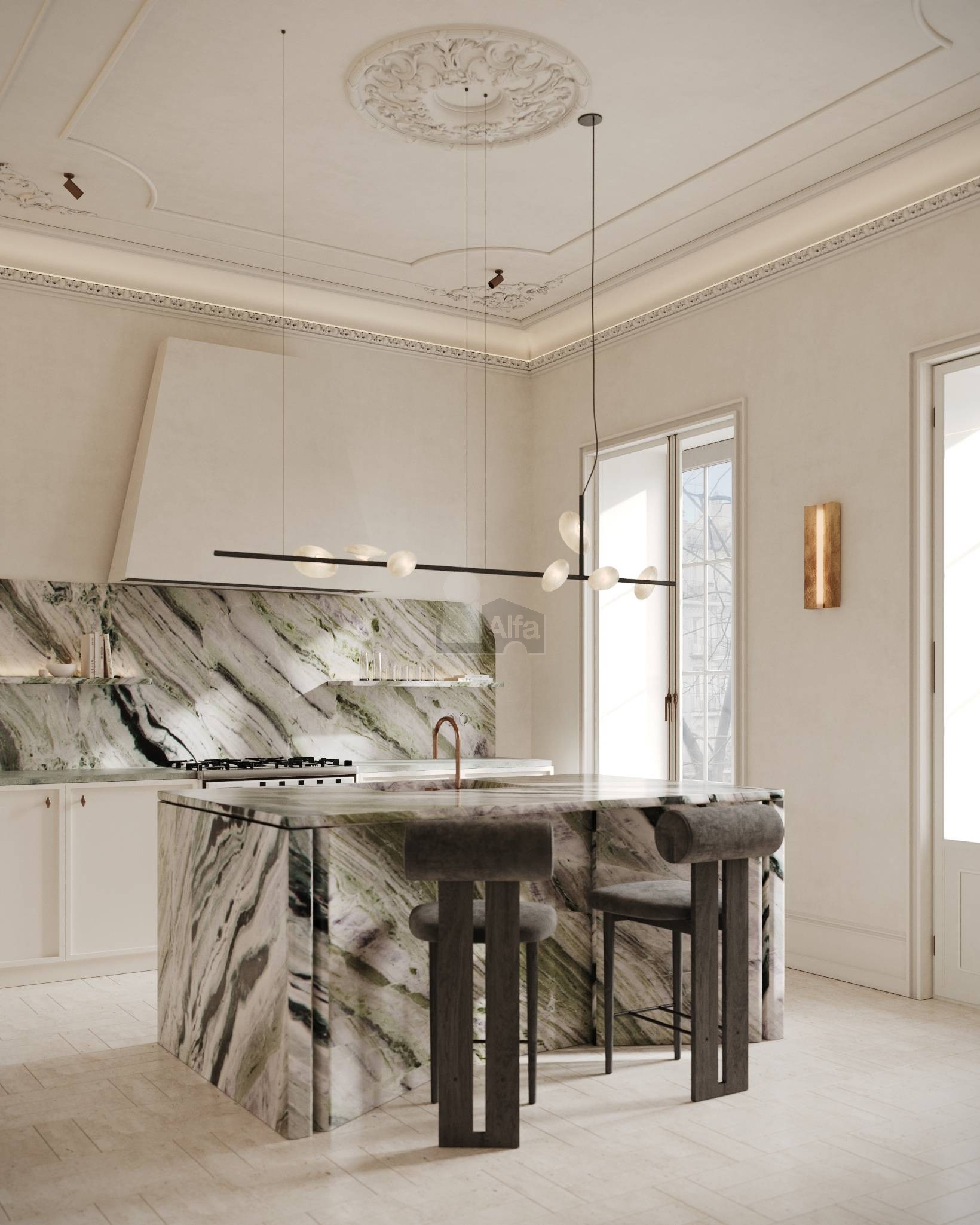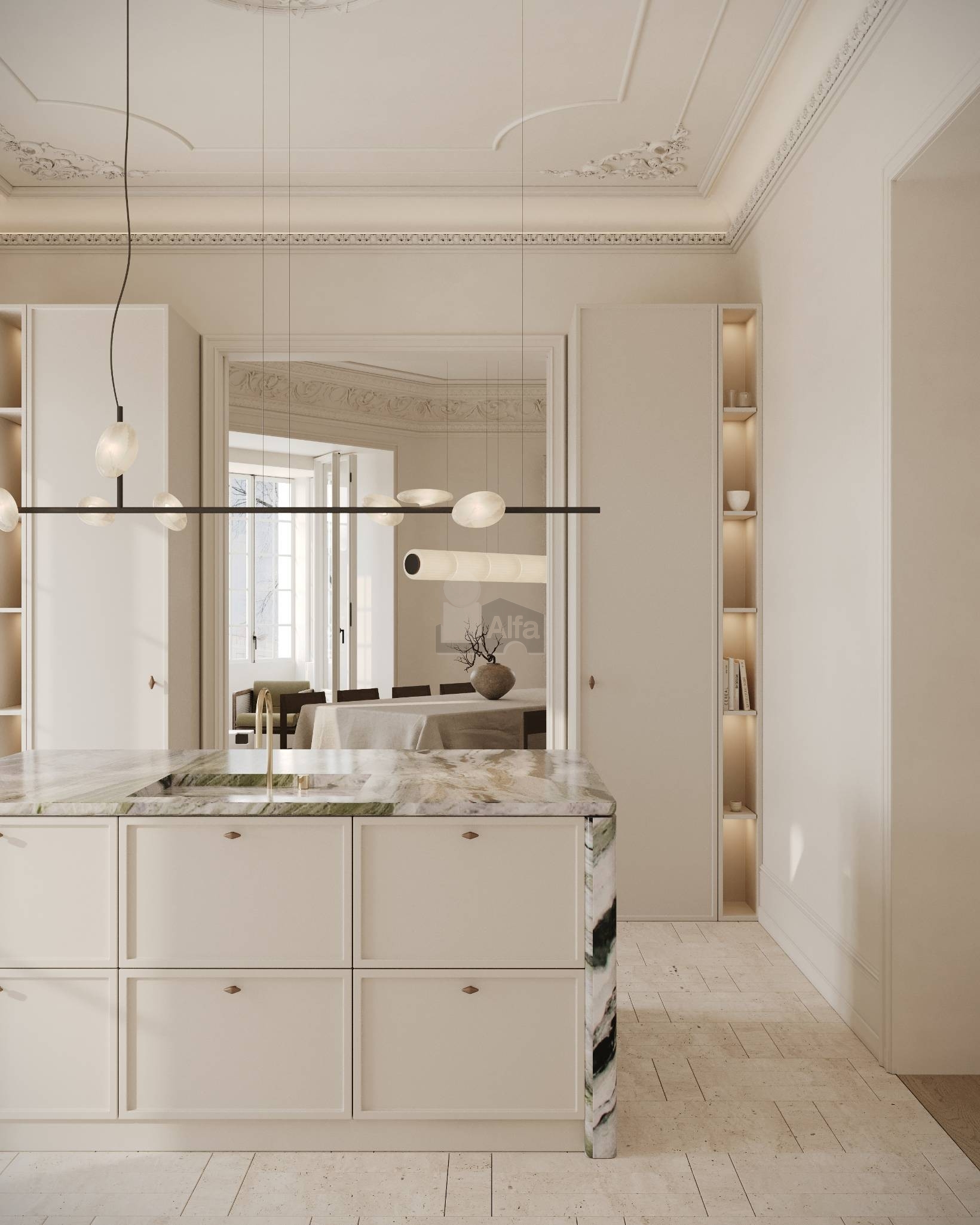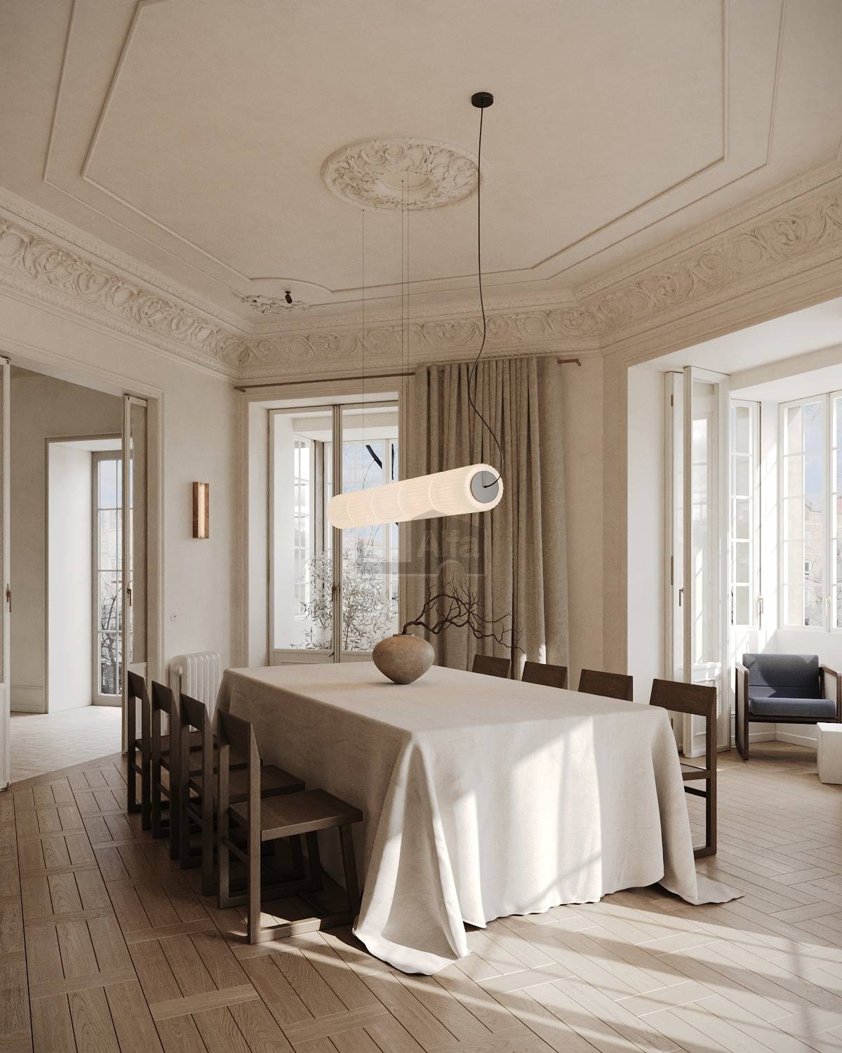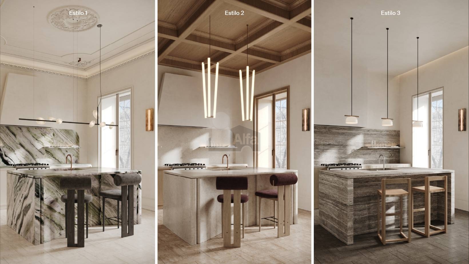 La propuesta de arquitectura e interiorismo para la propiedad se centra en realzar los elementos clásicos existentes, como cornisas y detalles de puertas y ventanas, integrándolos con elementos contemporáneos para crear un ambiente único. Este enfoque busca armonizar lo clásico y lo moderno, destacando el valor de cada elemento y mejorando la calidad del espacio. La distribución prioriza la conexión de los espacios de día, ubicándolos en la fachada principal. La cocina se orienta hacia la calle Goya, mientras que el comedor y zonas íntimas, como una acogedora zona de desayuno, se sitúan en los miradores. Estas áreas se conectan a una amplia zona social y un family room, facilitando la interacción y disfrute de los espacios comunes. El hall de entrada es un espacio funcional y agradable, ideal para conversaciones o disfrutar de una copa con amigos, y se busca minimizar la zona de pasillo para optimizar su función como conexión entre áreas comunes y dormitorios. La distribución de los dormitorios incluye una zona de servicio y un primer dormitorio con baño en suite. El dormitorio principal, con mirador hacia la calle Castelló, dispone de baño y vestidor exteriores. El tercer dormitorio cuenta con acceso a un vestidor, baño en suite exterior y vestidor complementario. El diseño equilibra funcionalidad, estética y comodidad, reforzando la convivencia entre lo clásico y lo contemporáneo.