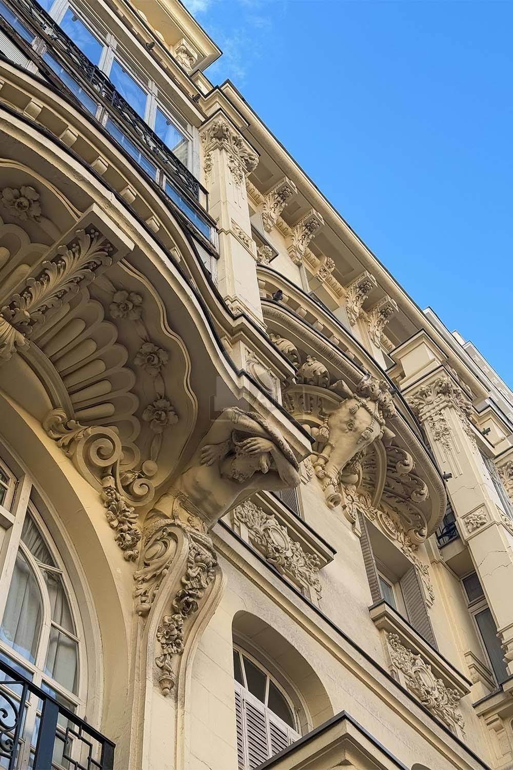 Decoración: Destacan las ménsulas con forma de cabeza de elefante que sostienen los balcones y la cúpula peraltada que remata la fachada. En la fachada el chaflán tiene un cuerpo de miradores para los pisos segundo y tercero, que se repite rítmicamente en los dos frentes, y coronado por una cúpula peraltada, diferente a la proyectada, que se eleva sobre las mansardas.
