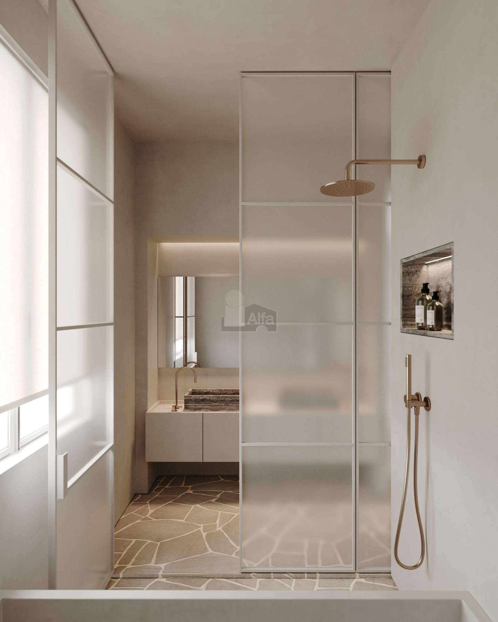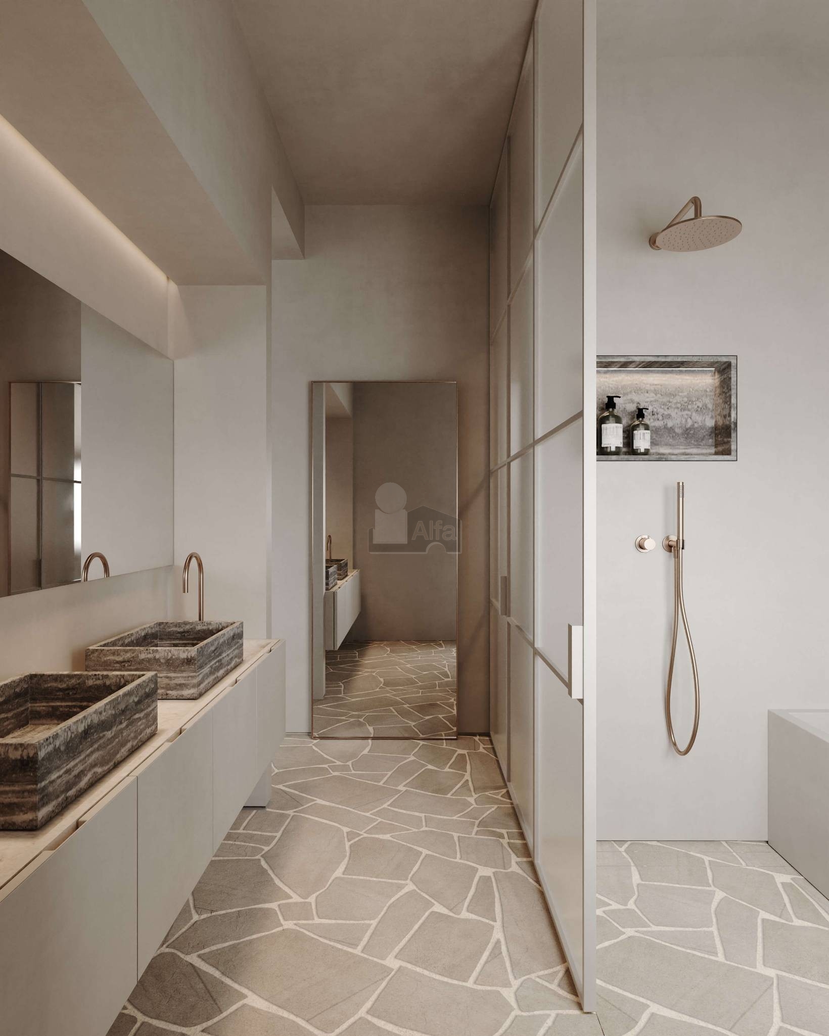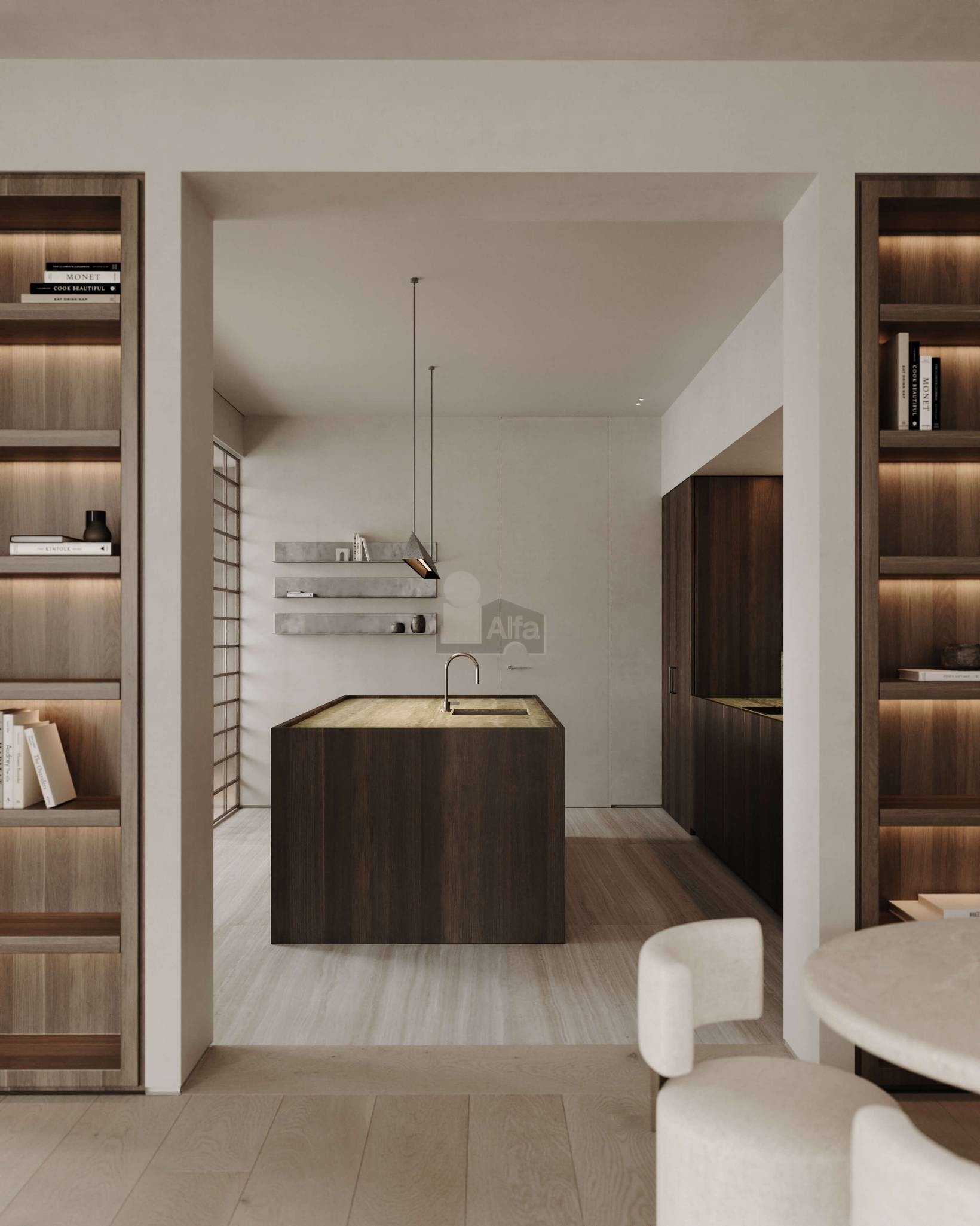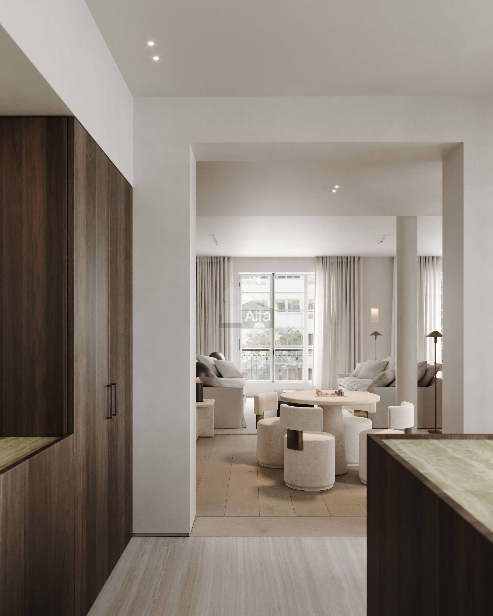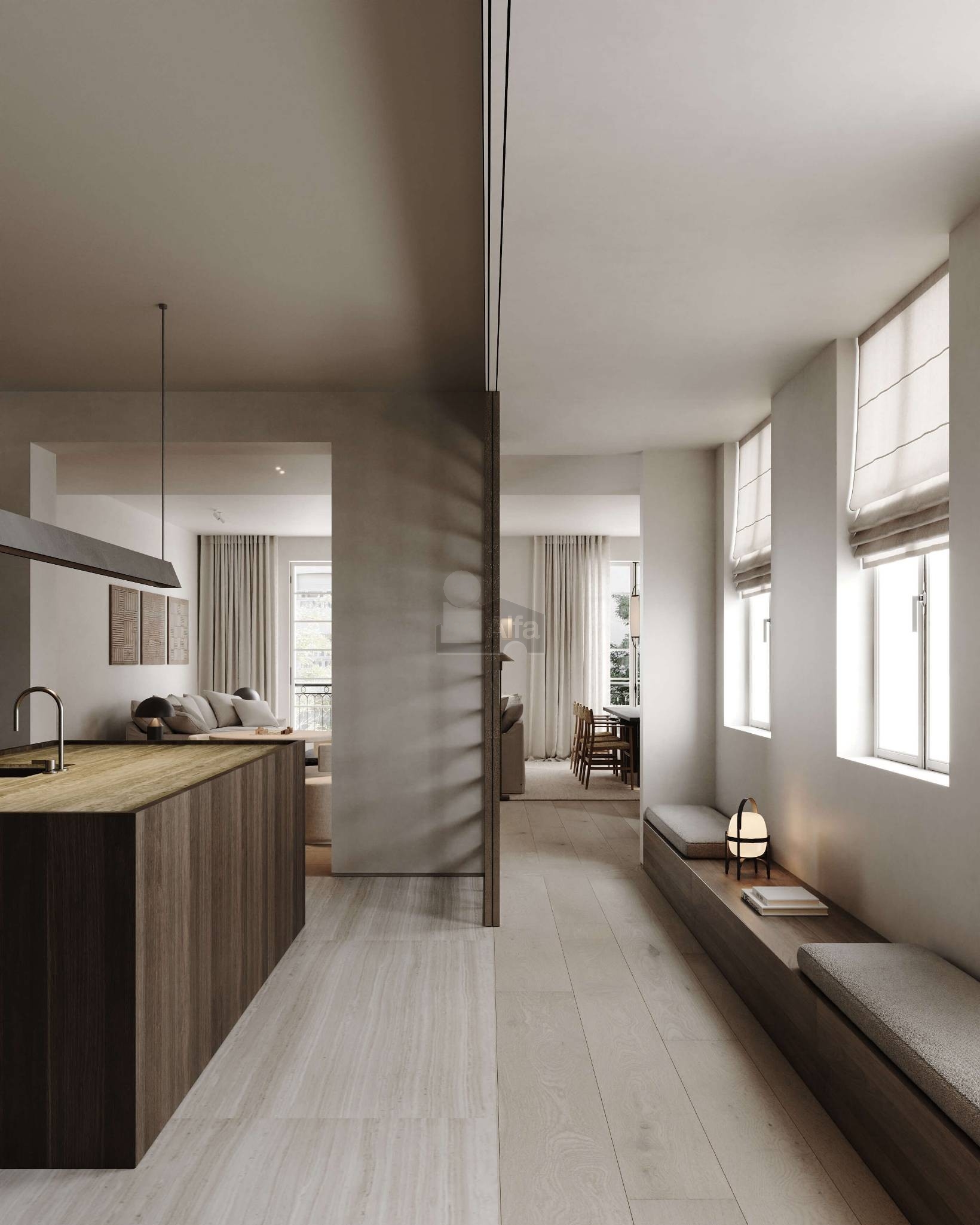 La propuesta de arquitectura e interiorismo para la propiedad, diseñada por nuestro arquitecto SO Arquitectura, se centra en la creación de espacios que equilibran la conexión con el exterior y la privacidad interior. Los espacios diurnos están orientados hacia el exterior, ofreciendo vistas y luminosidad, mientras que las zonas nocturnas se ubican hacia el interior, garantizando mayor intimidad. La cocina, amplia y detalladamente diseñada, ofrece la flexibilidad de ser un espacio diáfano o cerrado según las necesidades. El salón-comedor incluye un acogedor rincón de lectura, ideal para momentos de relajación. El diseño de las habitaciones se organiza alrededor de un distribuidor central con una cúpula impresionante, conectando dos habitaciones secundarias que comparten un baño espacioso con áreas separadas para la ducha y el inodoro. La habitación principal destaca por su gran vestidor y un baño compartimentado con ducha y bañera. Además, la propiedad incluye un dormitorio de servicio con baño en suite y un lavadero. Los materiales y el diseño han sido cuidadosamente seleccionados para asegurar una armonía estética y funcional, creando espacios que ofrecen experiencias de lujo y sofisticación.